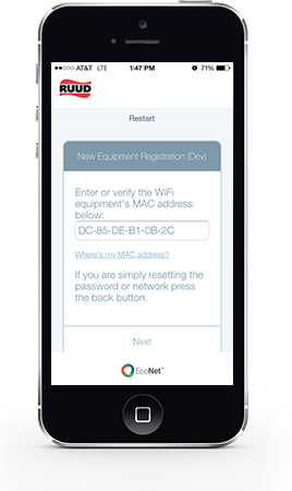 - When your registration is complete, you should be able to control your Ruud equipment and receive alerts through the Ruud EcoNet App.